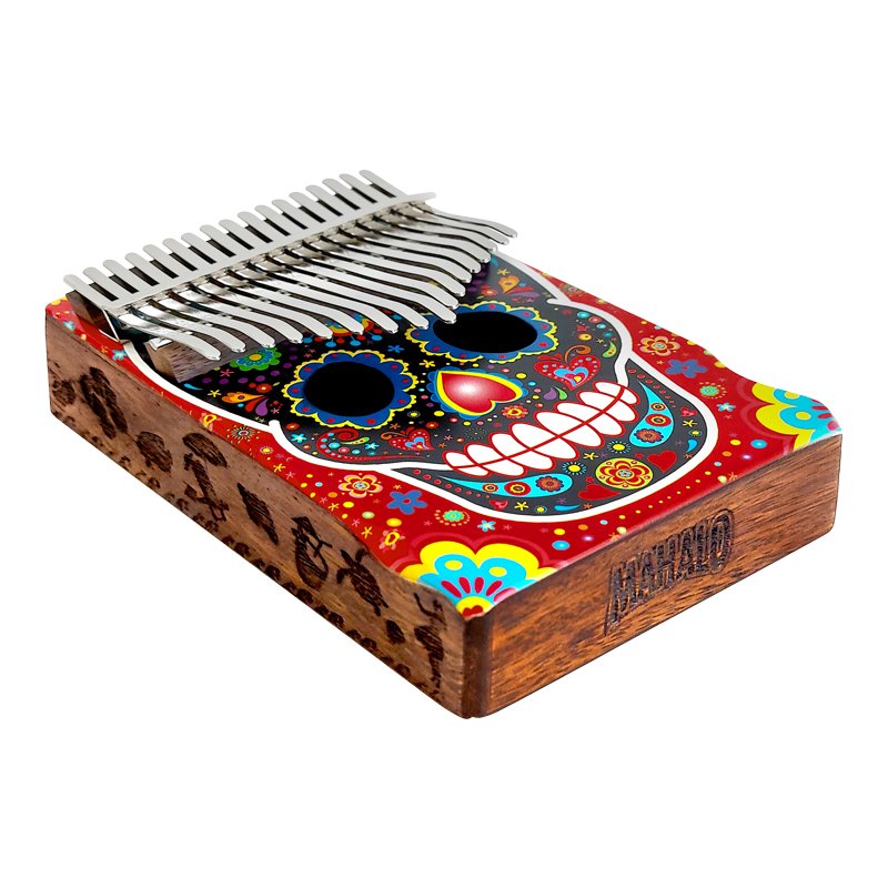 The Mahalo Kalimba Day of the Dead design is made from Trembesi wood and is a great-sounding, melodic instrument. Its compact size makes it an ideal travel instrument. It is perfect for solo playing or to accompany a ukulele for a unique, modern sound. It comes in a deluxe suede-look carry bag with a user guide and tuning hammer.